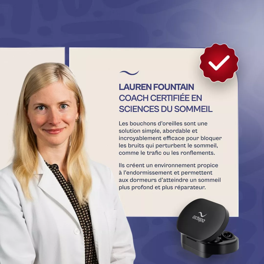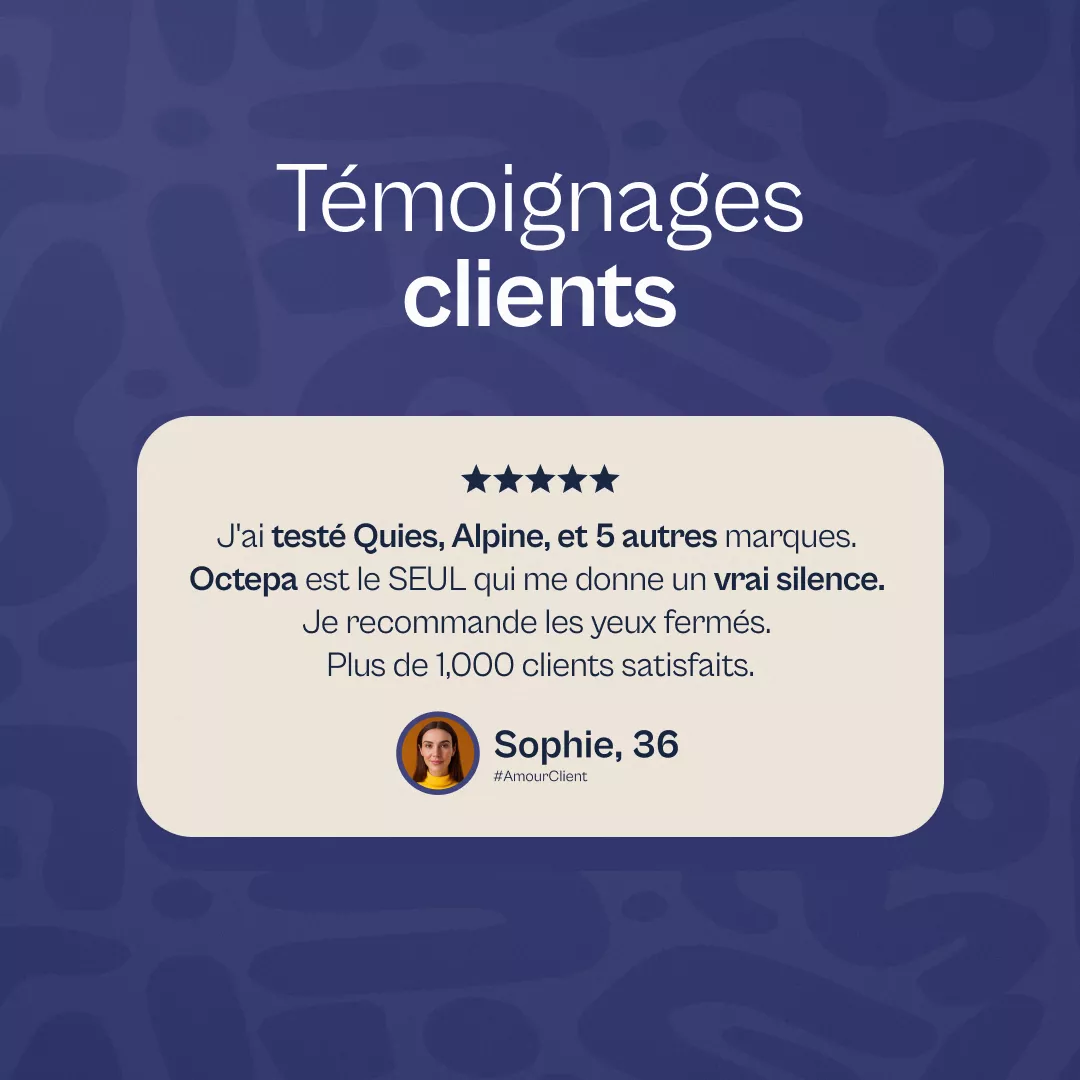 "Mon mari ronfle comme une machine à laver en plein essorage. Avec le bouchon Octepa, je dors enfin à côté de lui sans me réveiller 10 fois par nuit. Notre couple va mieux !"