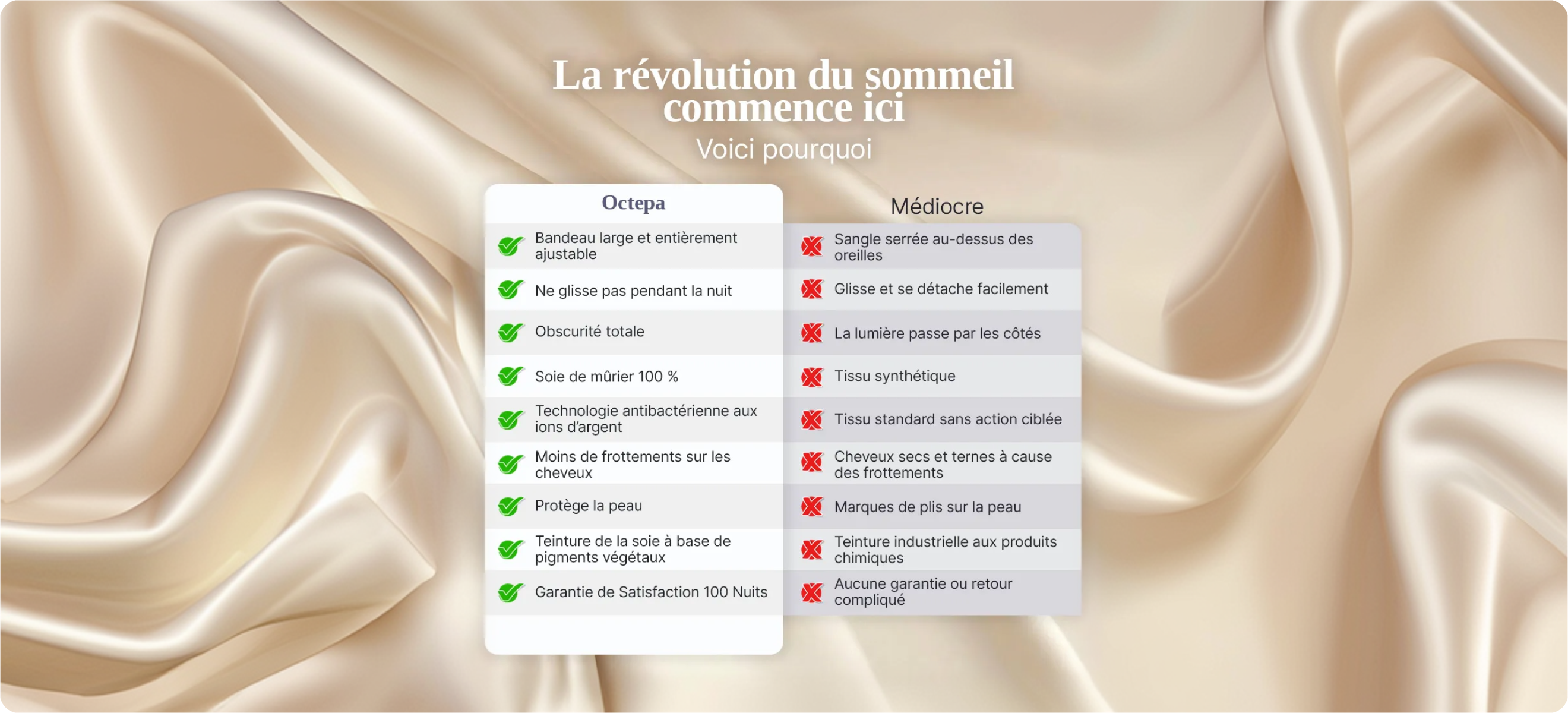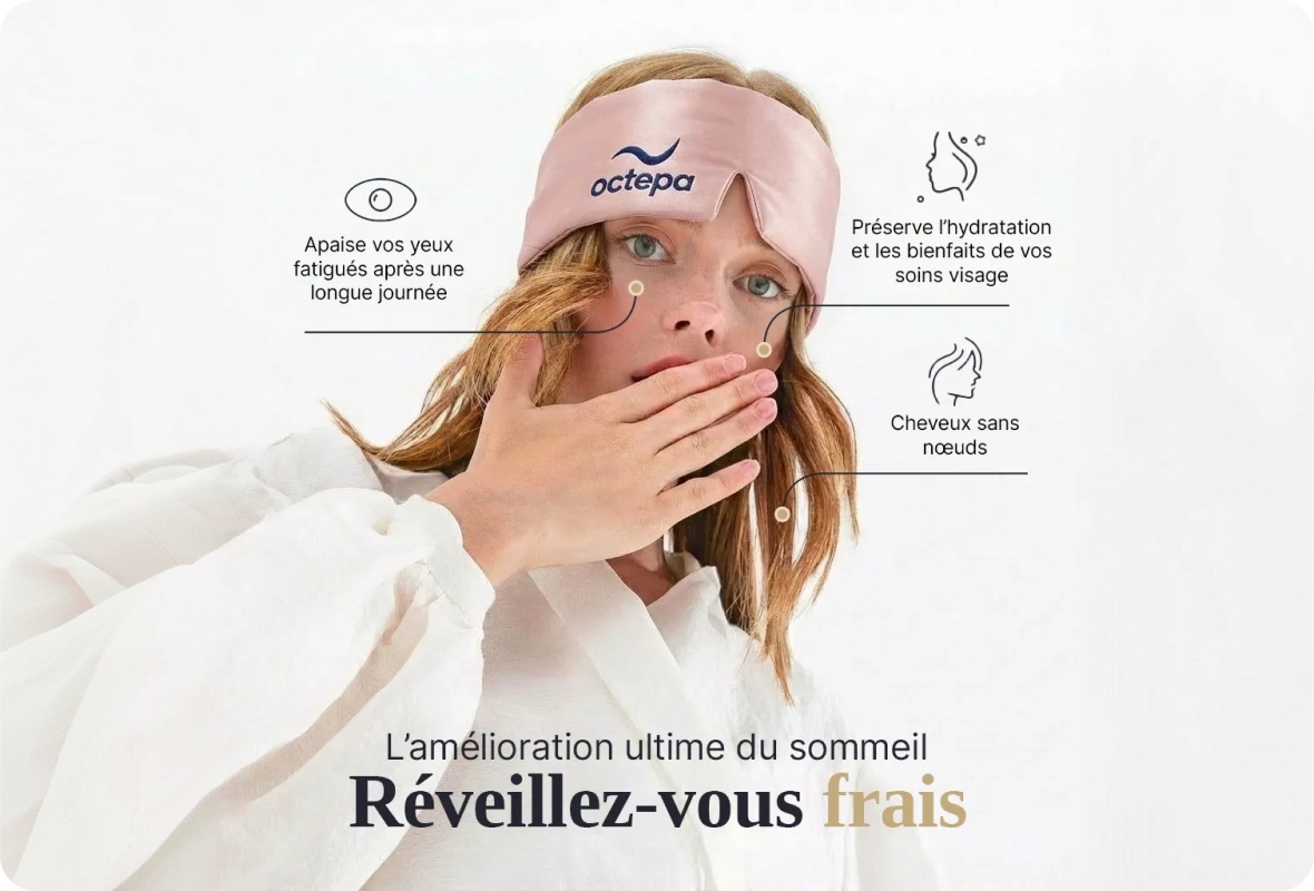 Le seul masque français en soie 22mm Grade 6A aux ions d'argent antibactériens qui active votre mélatonine naturelle pour un sommeil profond garanti.